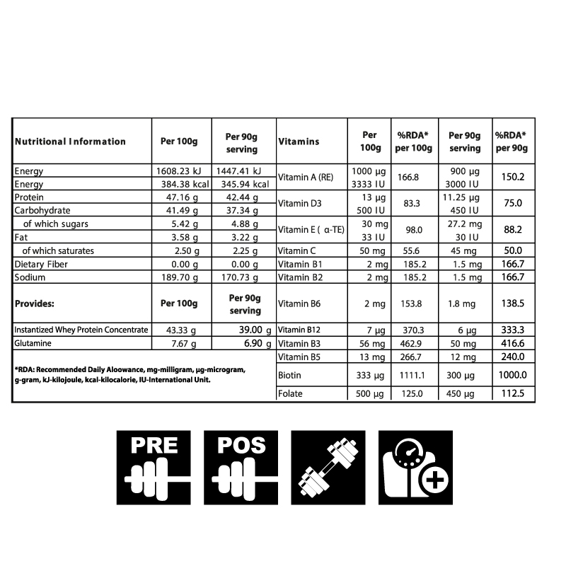 Add 3 scoops (90 grams) of Mass Plus to 400 ml of water or milk and serve it in 2-3 portions daily. For maximum result, drink it 2-3 hours before workout and 1 hour after workout, or as directed by a qualified nutritionist.